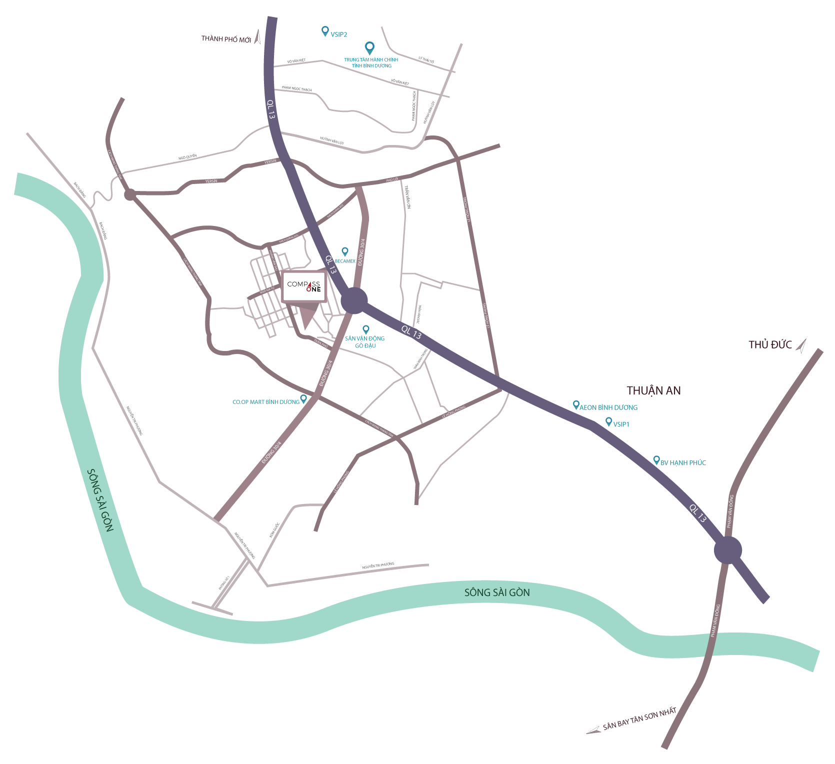 Dự án căn hộ Compass One tọa lạc tại Khu dân cư Chánh Nghĩa được mệnh danh là “Phố Tây” của Bình Dương với hàng loạt các tiện ích đẳng cấp phục vụ cư dân, là nơi tập trung nhiều doanh nhân, chuyên gia người nước ngoài, tạo nên một công đồng sống văn minh, hiện đại. Dự án căn hộ Compass One nắm một vị trí chiến lược tại mặt tiền đường Hoàng Văn Thụ, trung tâm Chánh Nghĩa, kết nối trực tiếp với Quốc lộ 13, tuyến giao thông huyết mạch để có thể dễ dàng di chuyển về các huyện, thành phố lân cận: Dĩ An, Thuận An, Tân Uyên…. Đặc biệt di chuyển về TP.HCM chỉ từ 20 phút. Giá bán – cho thuê căn hộ Compass One tháng 10/2025 cập nhật liên tục tại đây.